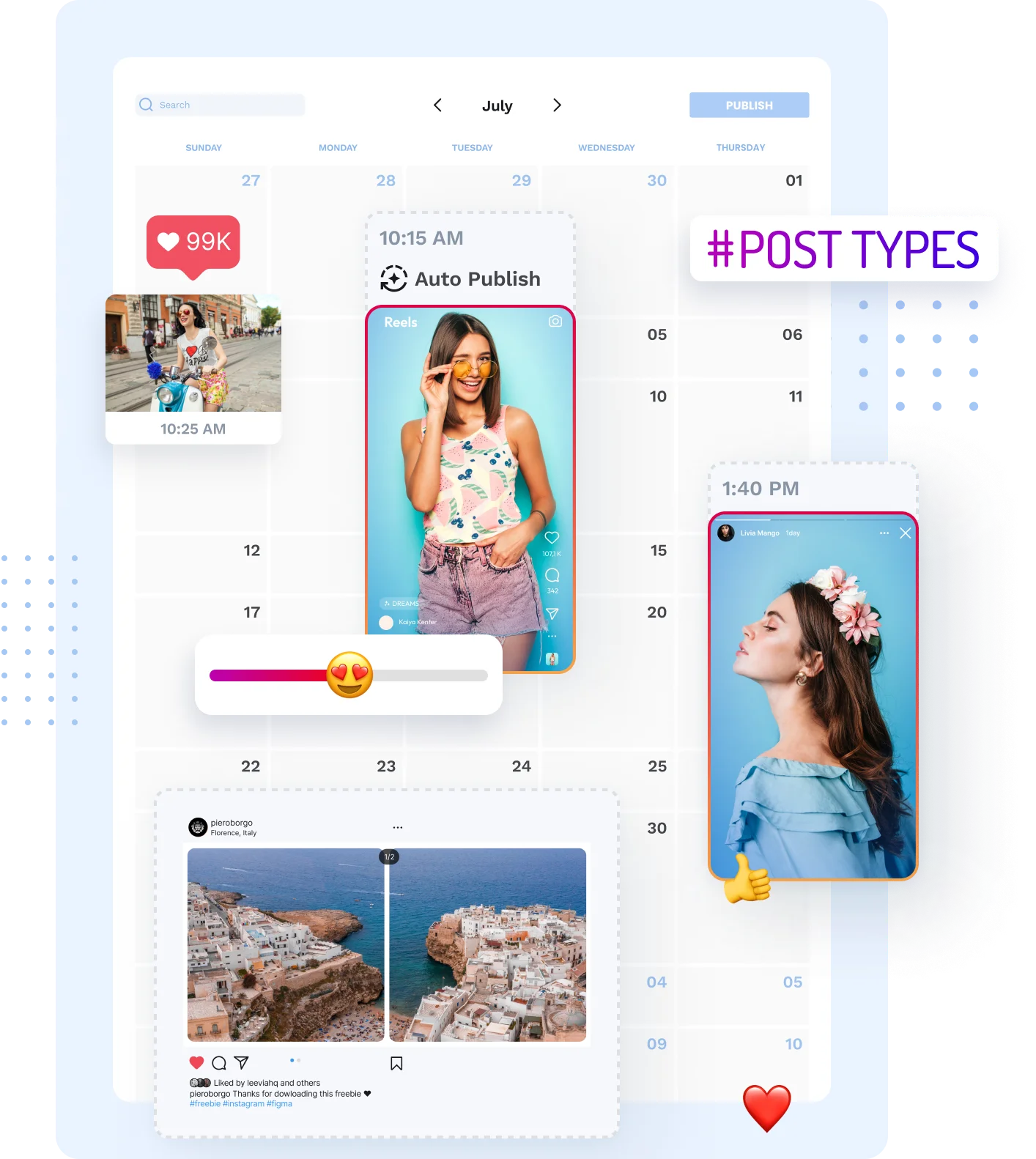 Visually plan & schedule Reels to automatically publish. Moderate & reply to comments using the Inbox tool, and get detailed Reels Analytics to optimize all of your posts.
